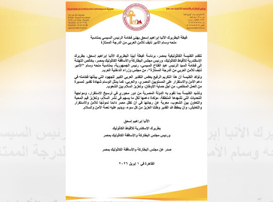 غبطة البطريرك الأنبا إبراهيم إسحق يهنئ فخامة الرئيس السيسي بمناسبة منحه وسام الأمير نايف للأمن العربي من الدرجة الممتازة