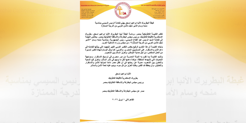 غبطة البطريرك الأنبا إبراهيم إسحق يهنئ فخامة الرئيس السيسي بمناسبة منحه وسام الأمير نايف للأمن العربي من الدرجة الممتازة في المواقع الإخبارية10 ساعات ago