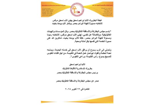 غبطة البطريرك الأنبا إبراهيم إسحق يهنئ الأب إسحق مرقس لانتخابه مسؤولًا لكهنة البرادو بمصر ويشكر الأب يوحنا بخيت في المواقع الإخبارية48 seconds ago