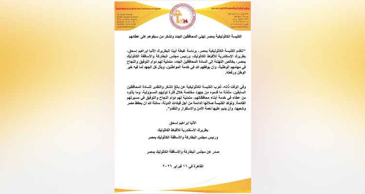 “تتقدم الكنيسة الكاثوليكية بمصر، برئاسة غبطة أبينا البطريرك الأنبا إبراهيم إسحق، بطريرك الإسكندرية للأقباط الكاثوليك، ورئيس مجلس البطاركة والأساقفة الكاثوليك بمصر، بخالص التهنئة إلى السادة المحافظين الجدد، متمنية لهم دوام التوفيق والنجاح في مهامهم الوطنية، وأن يوفقهم الله في خدمة المواطنين، وبذل كل الجهد لما فيه خير الوطن ورفعته.