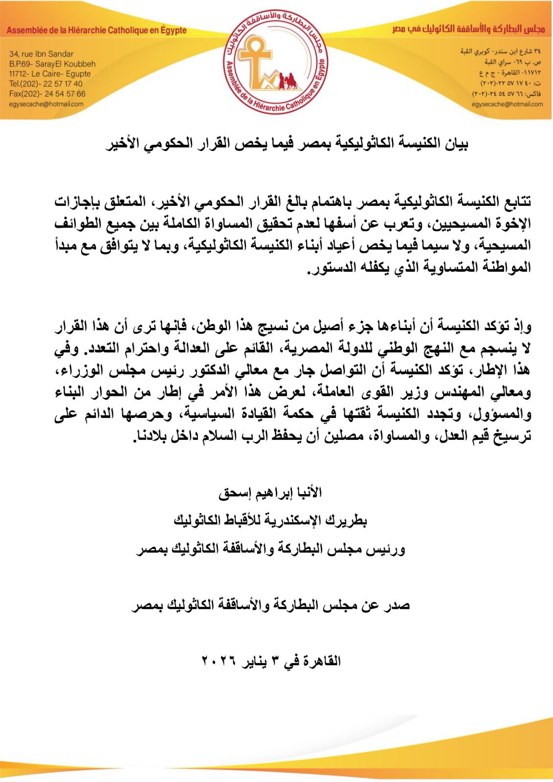 الكنيسة الكاثوليكية بمصركنيسة الأقباط الكاثوليككنيسة الموارنة الكاثوليكغبطة البطريرك الأنبا إبراهيم إسحق يشارك في احتفال اليوبيل الماسي لإنشاء إيبارشية القاهرة المارونية في المواقع الإخبارية