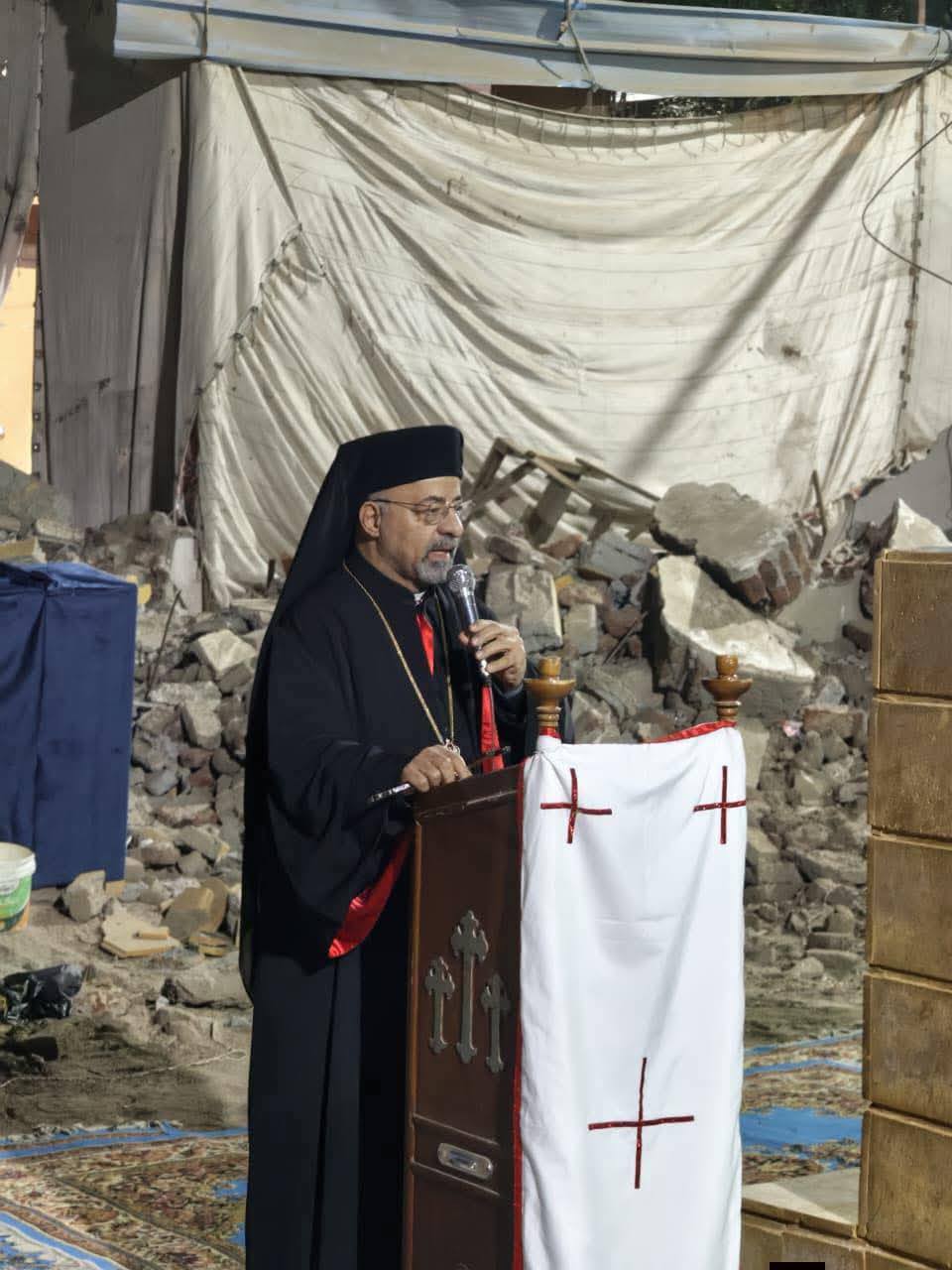وتحدّث الأب البطريرك عن خبرته الماضيّة في القدّاس الإلهيّ الّذي حضره مع مجموعة من الآباء الأساقفة بعد هدم الكنيسة، وكيف كانت هذه الخبرة بمثابة تعزيّة ورجاء على الرّغم من كلّ الأنقاض، والرّكام الّذي أصبحت عليه الكنيسة. وأنّه بعيون الإيمان يرى هذا اليوم كعلامة قيامة، لذا فهو يقول للشعب “إخريستوس آنستي”. فهذا هو أفضل تعبير يمكن قوله بعد رؤية هذا الوضع الآن، فالله يُخرج الحياة من الموت، لنُعيد بناء هذه الجدران، وهذه الكنيسة الّتي قطعت مشورًا طويلاً في قيامتها، من ثقة وتضامن واتّحاد وإيمان.