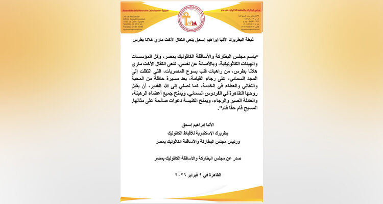 “باسم مجلس البطاركة والأساقفة الكاثوليك بمصر، وكل المؤسسات والهيئات الكاثوليكية، وبالأصالة عن نفسي، ننعي انتقال الأخت ماري هلانا بطرس، من راهبات قلب يسوع المصريات، التي انتقلت إلى المجد السمائي، على رجاء القيامة، بعد مسيرة حافلة من المحبة والتفاني والعطاء في الخدمة، كما نصلي إلى الله القدير، أن يقبل روحها الطاهرة في الفردوس السمائي، ويمنح جميع أعضاء الرهبنة، والعائلة الصبر والرجاء، ويمنح الكنيسة دعوات صالحة على مثالها. المسيح قام حقًا قام”.