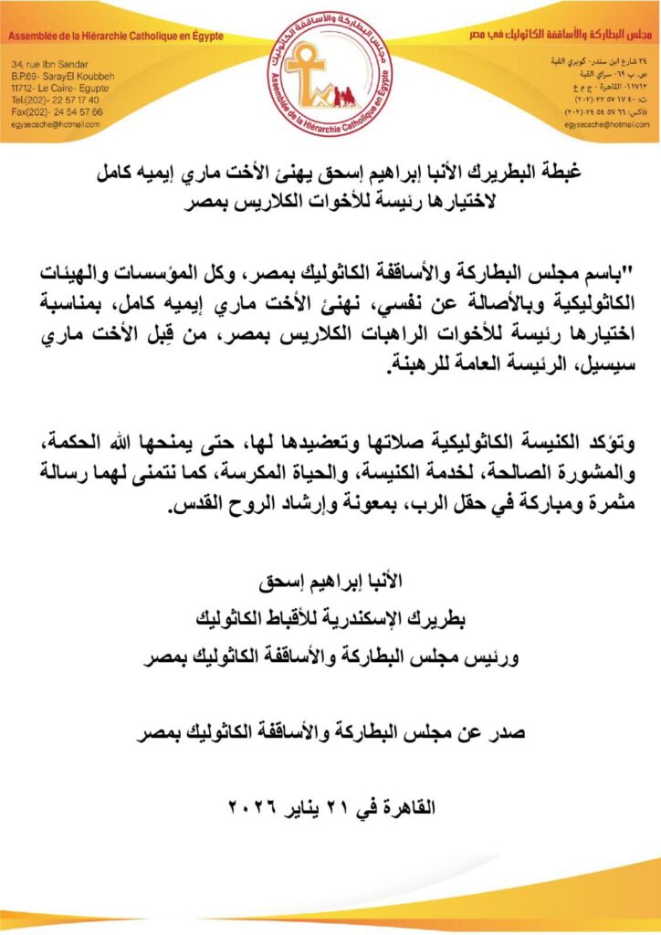 “باسم مجلس البطاركة والأساقفة الكاثوليك بمصر، وكل المؤسسات والهيئات الكاثوليكية وبالأصالة عن نفسي، نهنئ الأخت ماري إيميه كامل، بمناسبة اختيارها رئيسة للأخوات الراهبات الكلاريس بمصر، من قِبل الأخت ماري سيسيل، الرئيسة العامة للرهبنة.