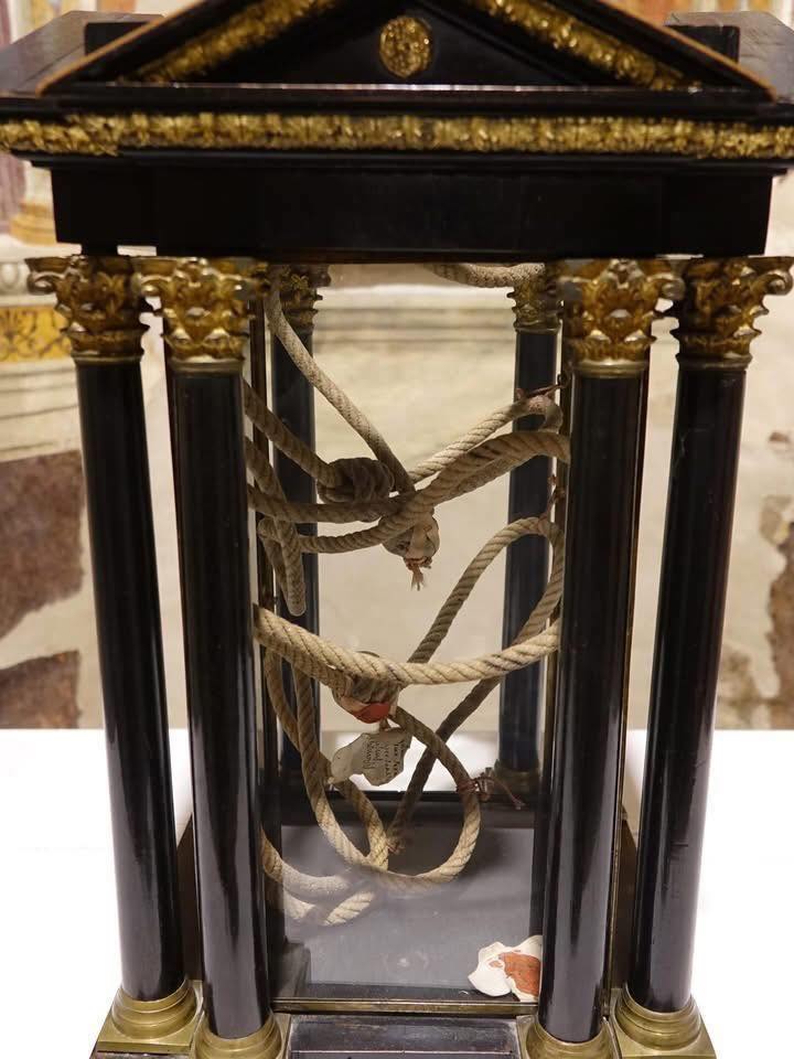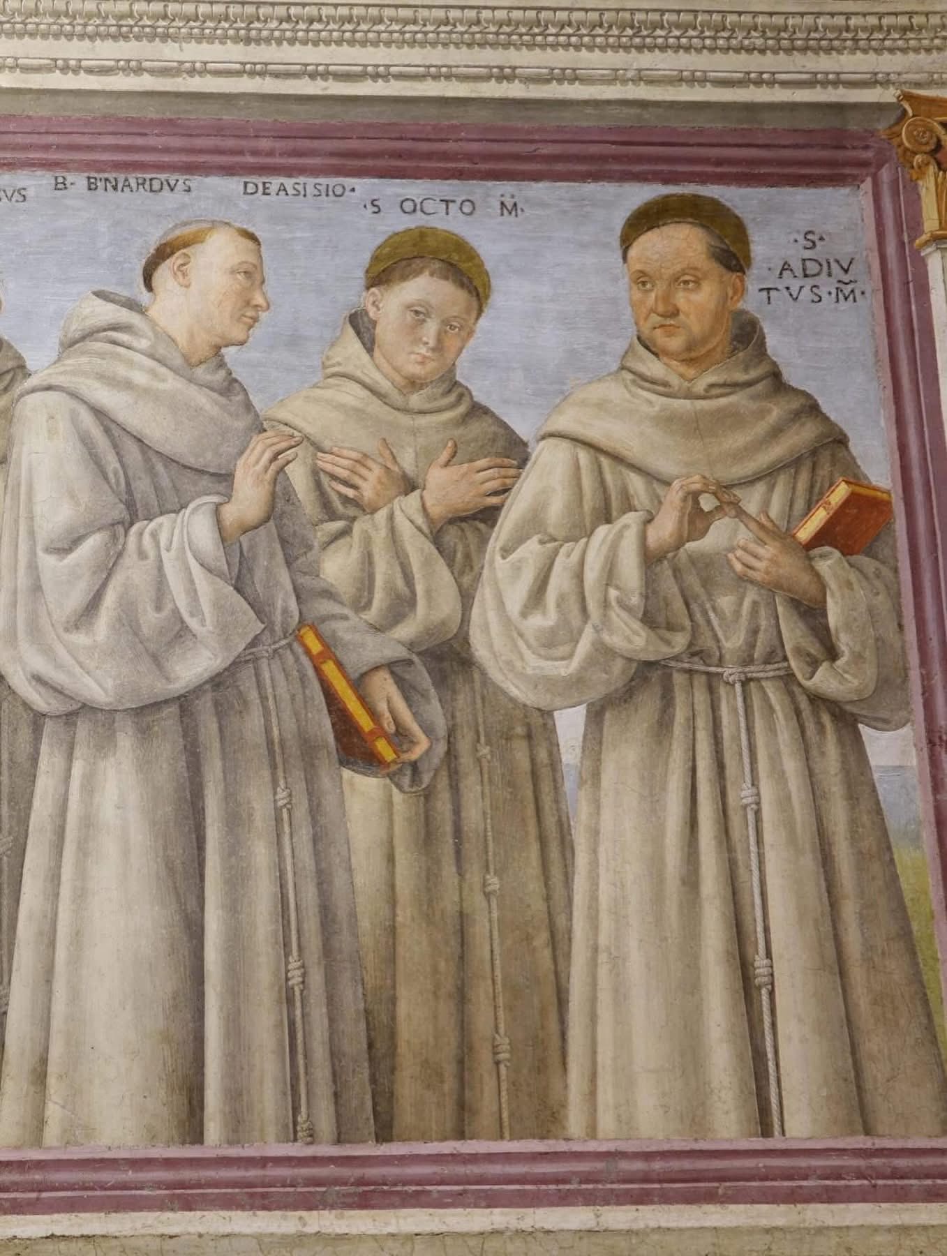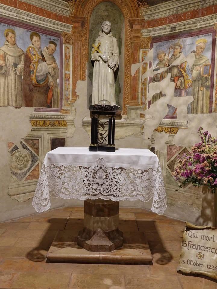 كذلك، يتوسط المكان تمثال خزفي مميز للقديس فرنسيس من إبداع أندريا ديلا روبيا، يظهره حاملًا الإنجيل والصليب، كواعظ حيّ يواصل إرشاد المؤمنين إلى طريق الإنجيل.