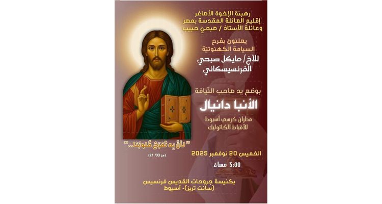 وتحتفل رهبنة الإخوة الأصاغر، إقليم العائلة المقدسة بمصر، بهذه المناسبة الكهنوتية، المقرر لها الخامسة من مساء الخميس المقبل، الموافق العشرين من نوفمبر الجاري.