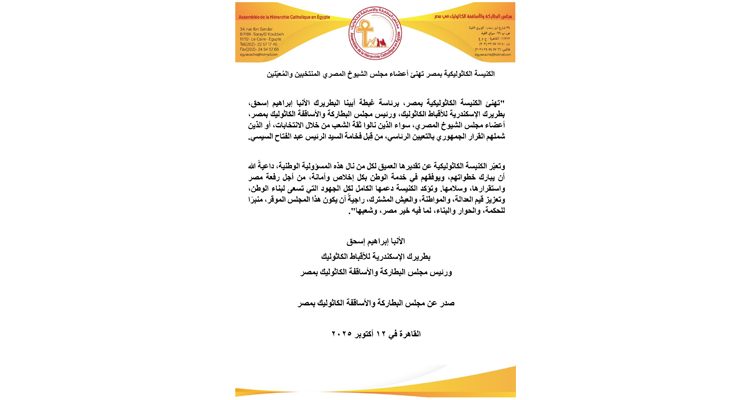 الكنيسة الكاثوليكية بمصر تهنئ أعضاء مجلس الشيوخ المصري المنتخبين والمُعيّنين