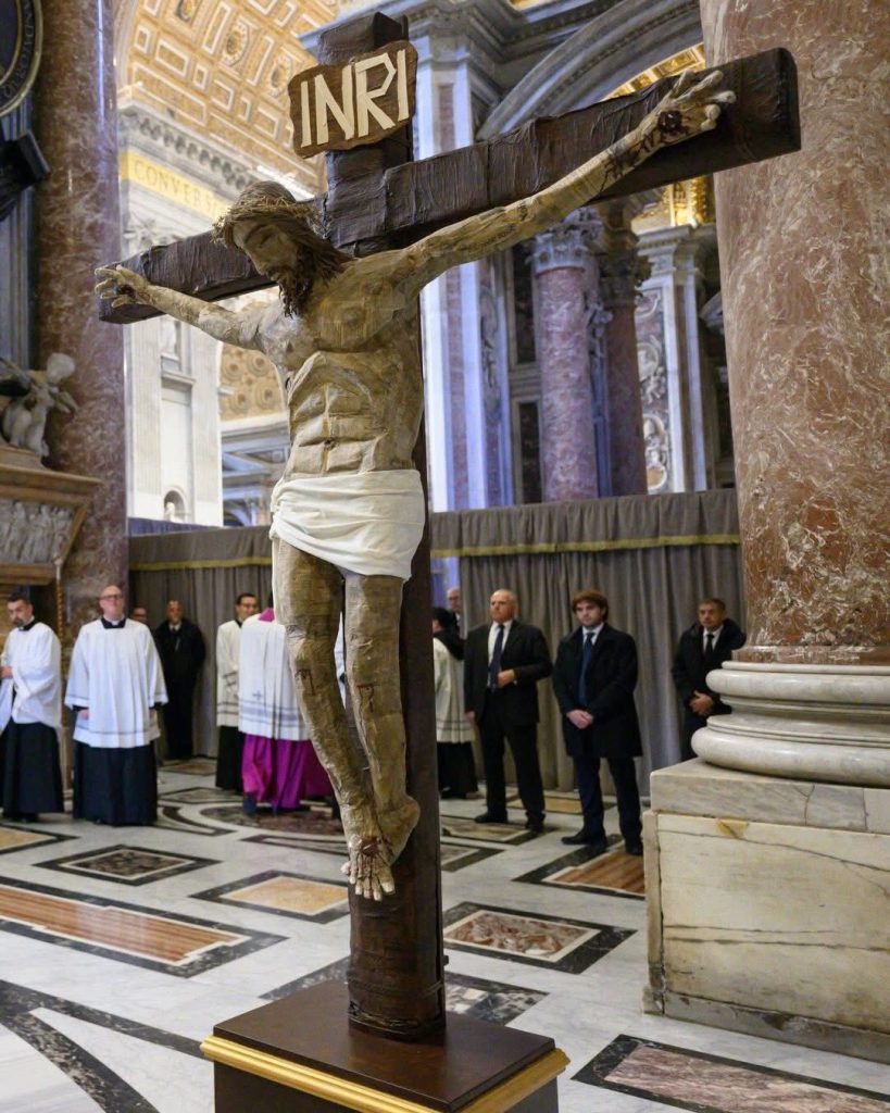الصليب، الذي لم يكن عملاً فنّيًا تقليديًا، صُنع بأيدي سجناء من سجن “تولميتزو”، في مقاطعة أوديني الإيطالية، باستخدام عجينة الورق، ومواد معاد تدويرها، في مبادرة إبداعية تعبّر عن قدرة الإنسان على تحويل الألم، والعزلة إلى معنى وروح، وحياة.