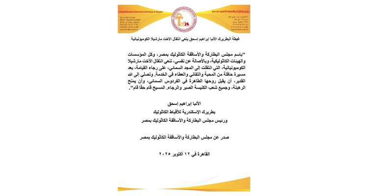 “باسم مجلس البطاركة والأساقفة الكاثوليك بمصر، وكل المؤسسات والهيئات الكاثوليكية، وبالأصالة عن نفسي، ننعي انتقال الأخت مارشيلا الكومبونيانية، التي انتقلت إلى المجد السمائي، على رجاء القيامة، بعد مسيرة حافلة من المحبة والتفاني والعطاء في الخدمة. ونصلي إلى الله القدير، أن يقبل روحها الطاهرة في الفردوس السمائي، وأن يمنح الرهبنة، وجميع شعب الكنيسة الصبر والرجاء. المسيح قام حقًا قام”.