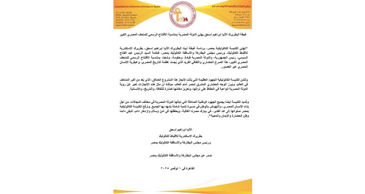 غبطة البطريرك الأنبا إبراهيم إسحق يهنئ الدولة المصرية بمناسبة الافتتاح الرسمي للمتحف المصري الكبير في المواقع الإخبارية