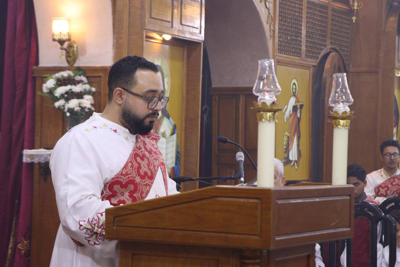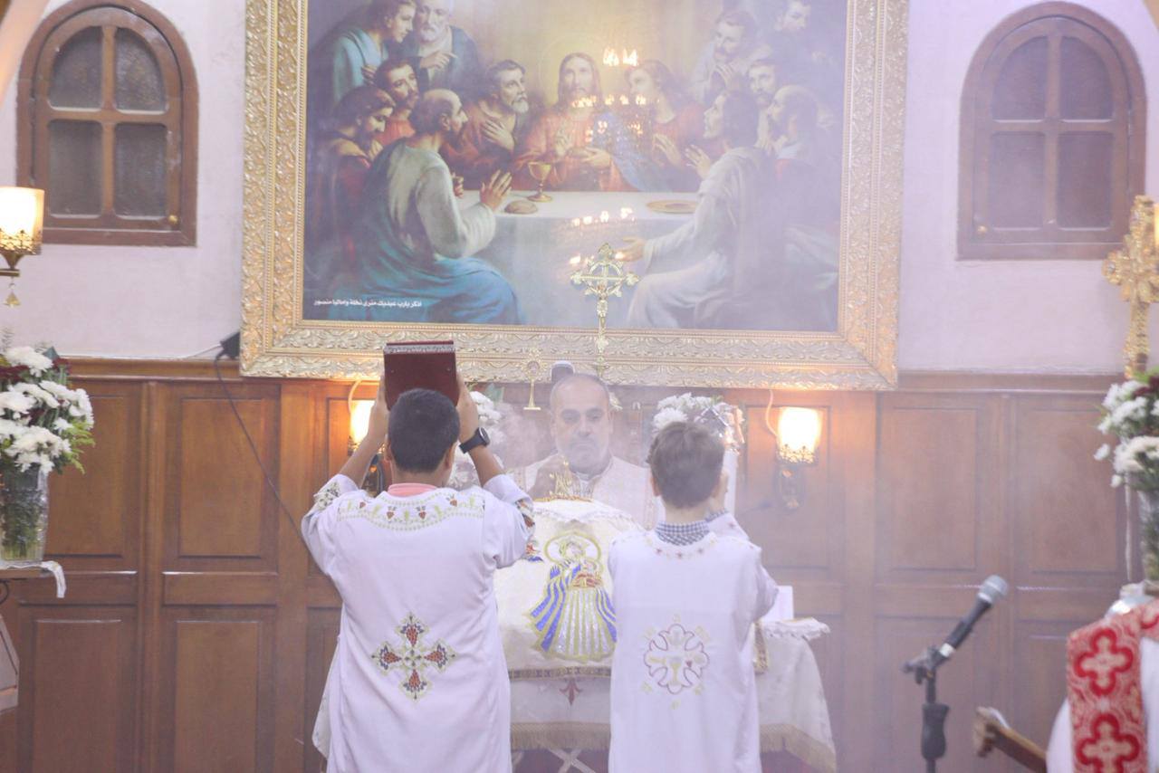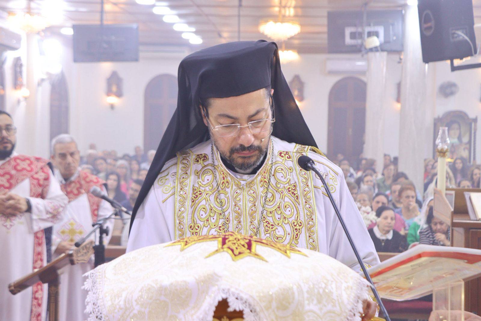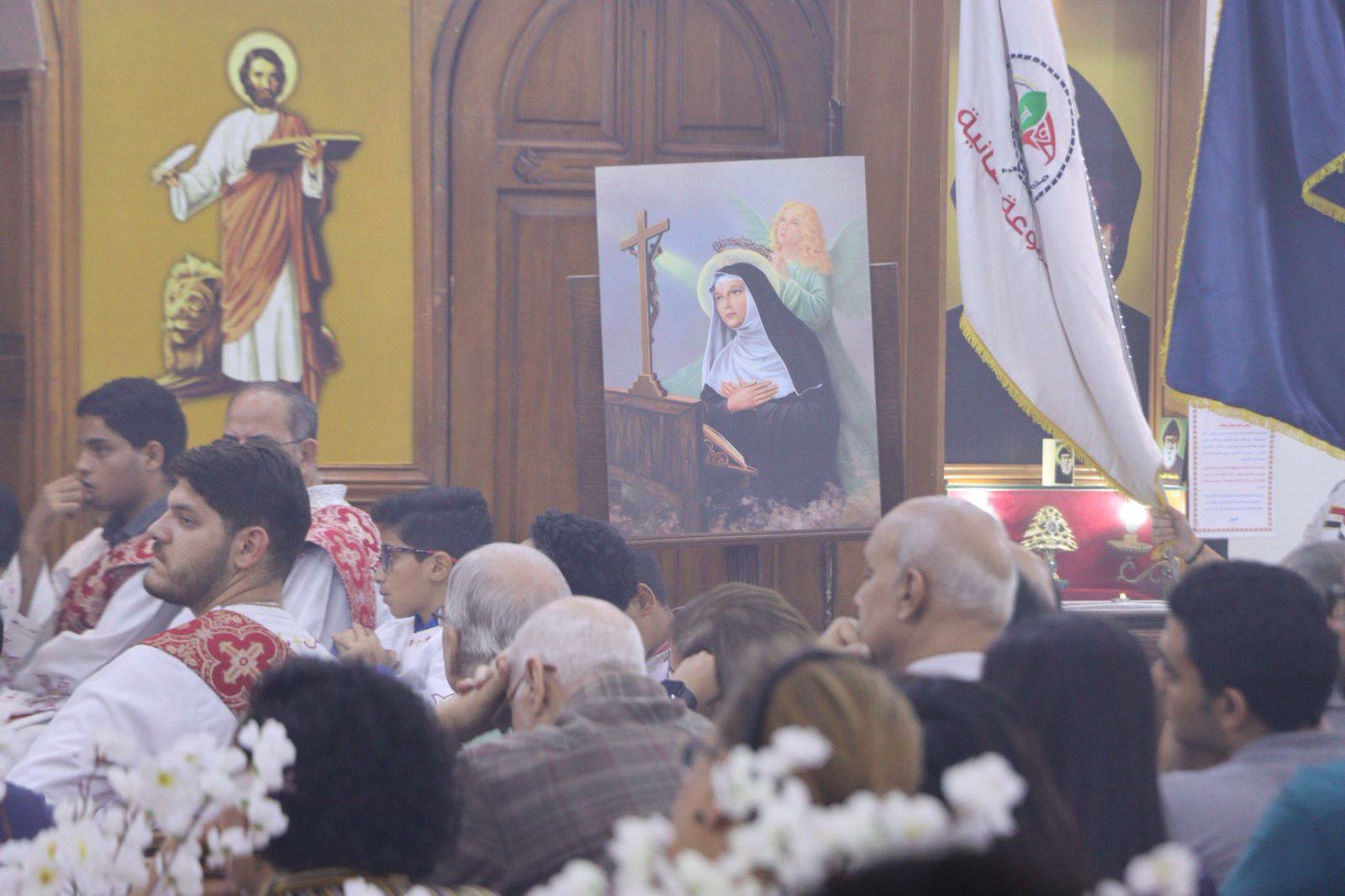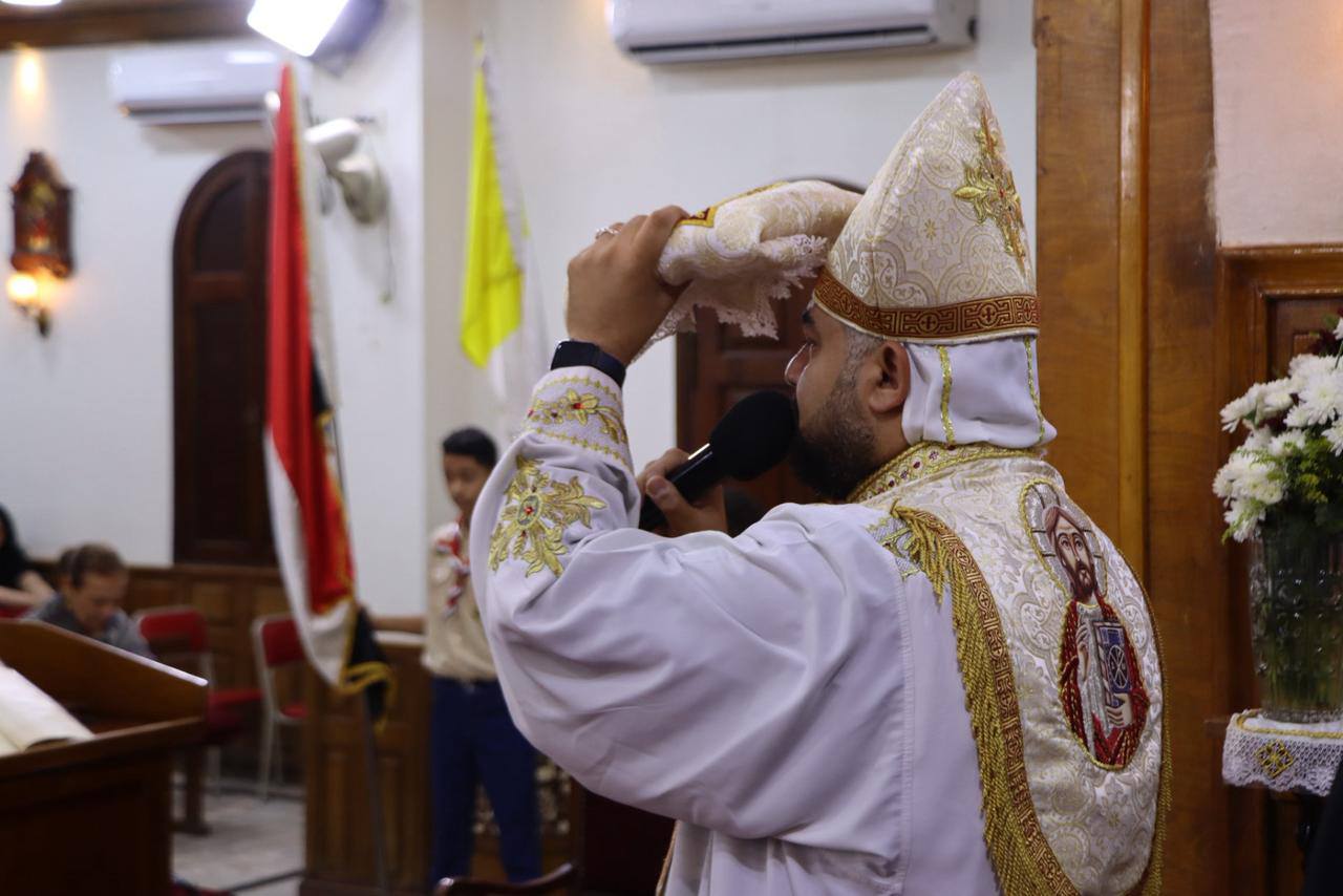 وعقب ذلك، ترأس صاحب النيافة صلاة القداس الإلهي، بمشاركة الأب ميشيل ألفي، راعي الكنيسة، والذي حصل على هذه الذخائر خلال تواجده في إيطاليا، والأب روماني فوزي، عميد الكلية الإكليريكية، بالمعادي، والأب ماركو مجدي، راعي كنيسة السيدة العذراء سلطانة السلام، بأوسيم، التابعة لإيبارشية الجيزة والفيوم وبني سويف للأقباط الكاثوليك.