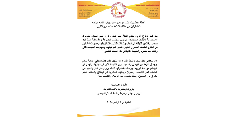 نقلا عن الفاتيكان نيوز 26 أغسطس  2025 كتب : فتحى ميلاد – المكتب الاعلامي الكاثوليكي بمصر . جاء في بيان...