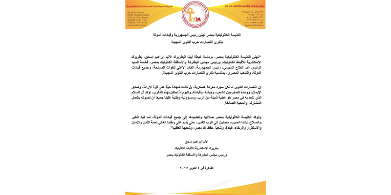 الكنيسة الكاثوليكية بمصر تهنئ رئيس الجمهورية وقيادات الدولة بذكرى انتصارات حرب أكتوبر المجيدة