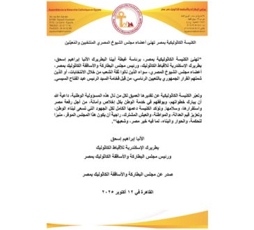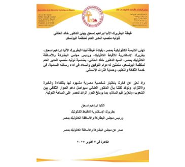 تهنئ الكنيسة الكاثوليكية بمصر، برئاسة غبطة أبينا البطريرك الأنبا إبراهيم إسحق، بطريرك الإسكندرية للأقباط الكاثوليك، ورئيس مجلس البطاركة والأساقفة الكاثوليك...