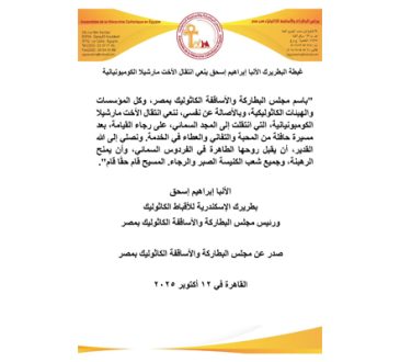 "باسم مجلس البطاركة والأساقفة الكاثوليك بمصر، وكل المؤسسات والهيئات الكاثوليكية، وبالأصالة عن نفسي، ننعي انتقال الأخت مارشيلا الكومبونيانية، التي انتقلت إلى المجد السمائي، على رجاء القيامة، بعد مسيرة حافلة من...