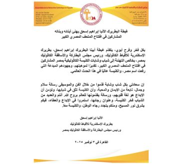 ٦ نوفمبر ٢٠٢٥ المكتب الإعلامي الكاثوليكي بمصر تحت رعاية غبطة أبينا البطريرك الأنبا إبراهيم إسحق، افتتح مساء اليوم، نيافة الأنبا باخوم، النائب البطريركي لشؤون الإيبارشيّة البطريركية، السلسلة الخامسة من اجتماعات...
